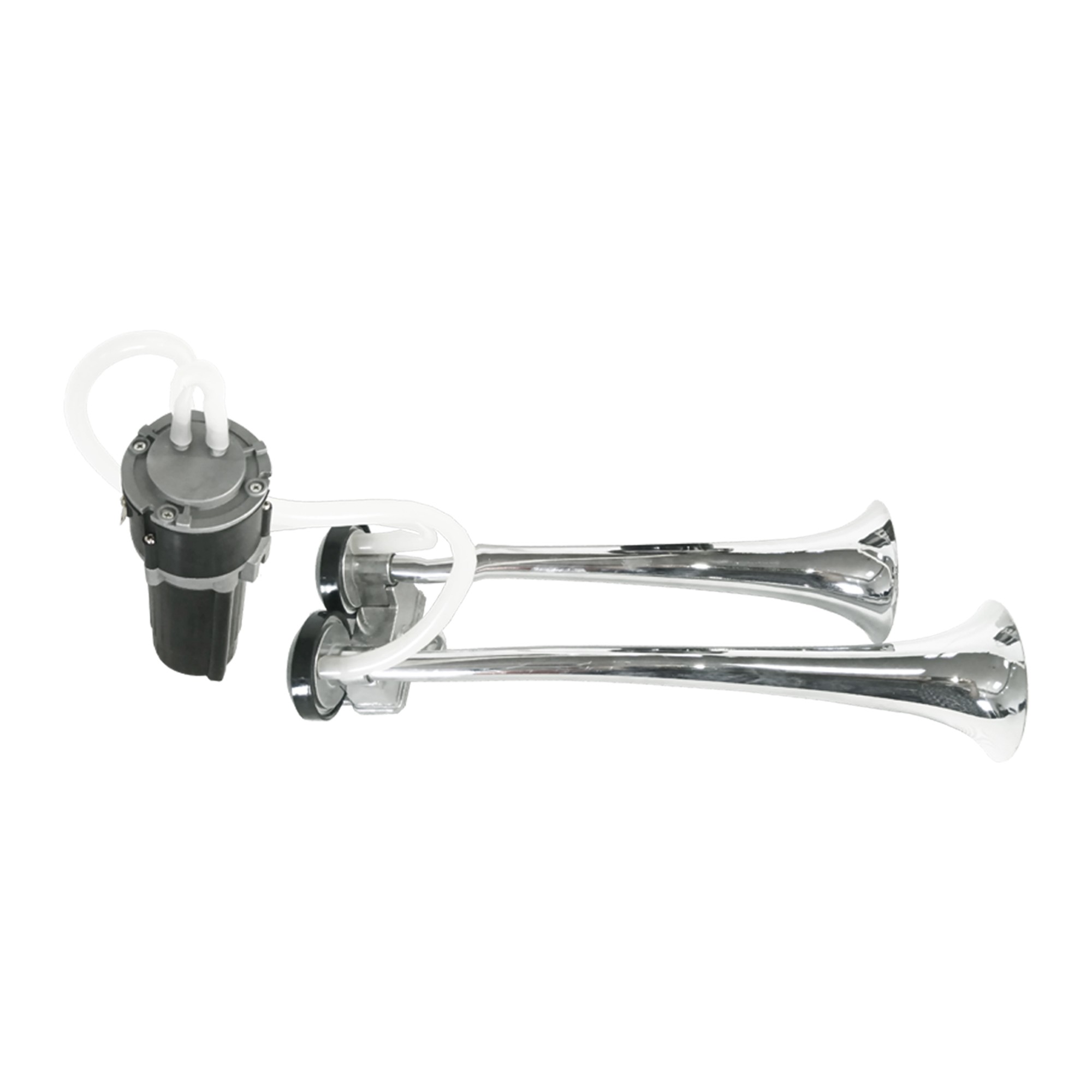 Tromba ad aria bitonale 24V tipo "Truck", completa di compressore ad alte prestazioni, ideale per camion, pullman, veicoli industriali e mezzi agricoli. Le trombe in alluminio generano un suono a doppia tonalità fino a 118 dB, tipico dei grandi mezzi pesanti, per una segnalazione acustica potente e chiaramente udibile anche in ambienti rumorosi.